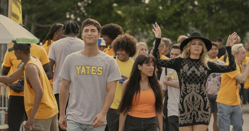 Skinner is already enough of a cultural personage to have tempted Jennifer Aniston into participating in a prank video; here his cultural mojo is signaled by the presence of Charli XCX (also the music supervisor) in a funny extended cameo as herself, which will excite younger viewers, as the presence of MacLachlan and Connie Britton as Benny’s parents may impress older. Other famous faces briefly seen include Andrea Martin as the school’s dean, Didi Conn as Grace’s “adopt-a-grandmother,” Megan Fox as a talking Megan Fox poster, Bowen Yang, Matt Rogers and Lukas Gage as the boy who got away before Benny knew what he was looking for. Rish Shah plays Miles, a handsome classmate with whom Benny connects, and one of the series’ more grounded persons. Barely recognizable from “Welcome to Flatch” is Holmes as Carmen’s roommate Hailee, a rococo ice cream sundae of a person, talking a mile a minute, sweet and dim; as on “Flatch,” she is quite wonderful.