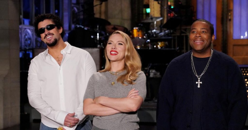 It was a night that didn’t deliver any news on the rumors that Johansson’s husband, Colin Jost of “Weekend Update,” or his co-host Michael Che, would be leaving the show. Instead, the two engaged in their joke exchange ritual, and multiple guest stars showed up in sketches, including Mike Myers, Gina Gershon and Emily Ratajkowski in a video piece, and musical guest Bad Bunny.